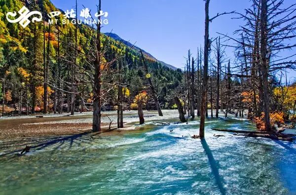 秋天里四姑娘山的水在阳光的照射下,泛着点点星光,就像是星星在水里洗澡。水平如镜的湖面也倒映着彩色的山体,走几步,水中的影子仿佛有种水中游的感觉。