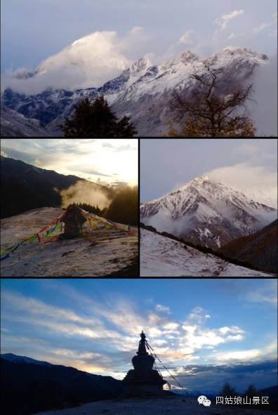 巴郎山口后转而下行,转过一个山口,四姑娘山豁然出现在眼前,四姑娘山最高峰幺妹峰海拔6250米,比排在身边的其他几个姐姐都挺拔秀丽,是四姑娘山峰中的主角。