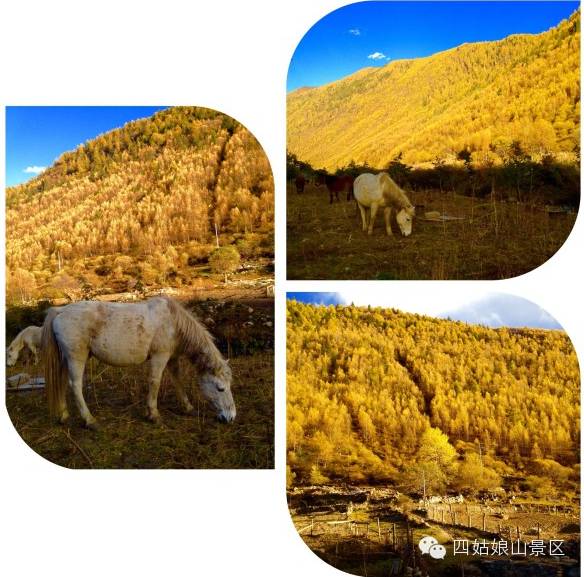 来到四姑娘山镇的杨二哥家住下,正值阳光金黄的时分,对面山坡上杨树金黄一片,几匹马儿悠闲地吃着草。