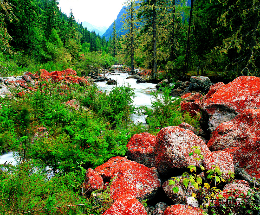 一堆红石散落在青葱的树林草丛之中。相传在很久以前,阿巴朗依化作山峰以后,四姑娘悲痛欲绝,哭着奔向父亲的遗体,她的眼泪流干了,血从她的眼睛里流了出来,染红了这片石头。